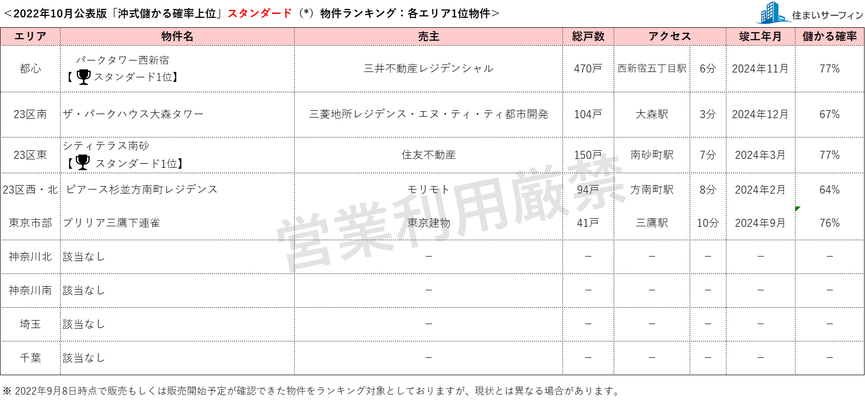 昨今のマンション価格の高騰を受け、購入検討時に資産性を重視する消費者の割合が高まりつつあります。このような社会動向と消費者ニーズをふまえ、「住まいサーフィン」では資産性を重視したマンション選びの支援を目的に、首都圏のマンションを「沖式儲かる確率」の高い順にランキング化し、毎月発表しています。対象物件は、首都圏で販売中および販売予定のマンションで、本リリースでは9エリアにおける“スタンダード(*)”物件と“家活(*)”物件それぞれ1位の物件のみを公表しています。