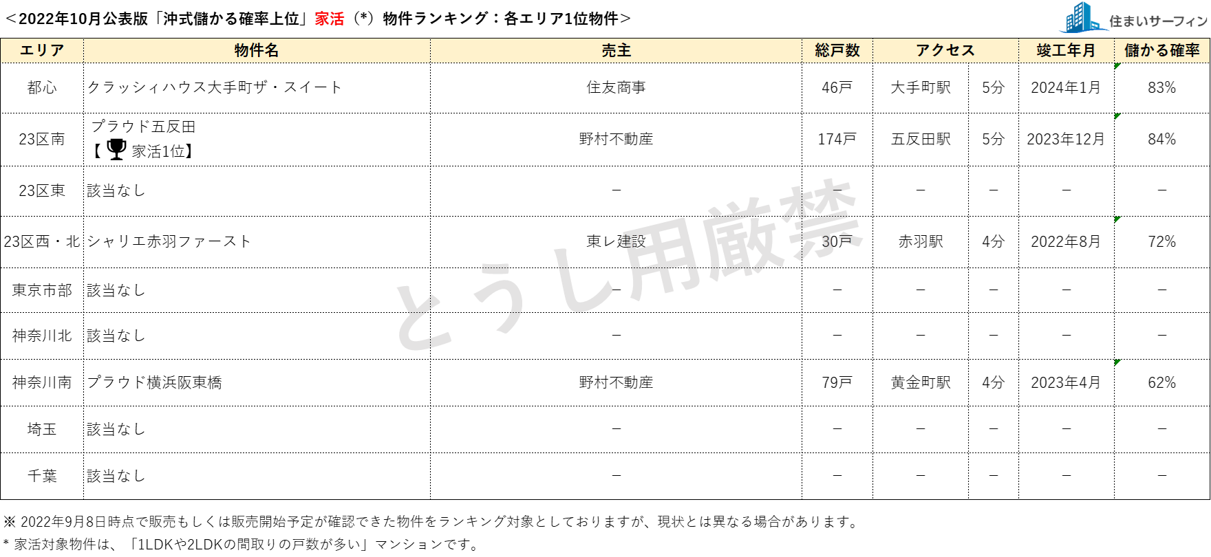 [住まいサーフィン]資産性の保たれやすいマンションがわかる首都圏エリア別「沖式儲かる確率上位マンションランキング」2022年10月版公表