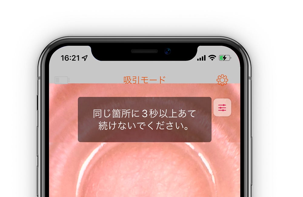 アレティのポアスコープはオーバーケアによる内出血などを防ぐため、3秒以上吸引し続けるとスマホの画面に注意のメッセージが出ますが、最初は弱モードでお試しください。また、使用頻度は週に2回まで、毎回5分以内を目安にし、正しく使用することでスキンケア効果を実感いただけます。