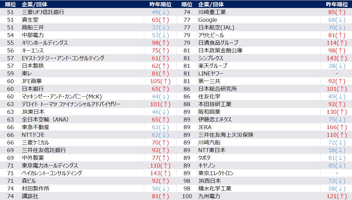 金融業界は、領域によって、昨年同時期からの変化が分かれました。メガバンクは人気を維持。(三菱UFJ銀行(9位→6位)、三井住友銀行(19位→20位)、みずほフィナンシャルグループ(30位→34位)。)政府系金融機関(系統金融機関含む)は昨年に引き続き順位が上昇しました。国際協力銀行(44位→42位)、日本銀行(65位→60位)、日本政策金融公庫(98位→81位)が代表的です。日本政策投資銀行(6位→13位)、農林中央金庫(20位→32位)は、順位は下降したものの上位50社にランクインしています。一方で、証券・損害保険・生命保険は順位を下げたところが目立ち、東京海上日動火災保険(51位→36位)のみTOP100にランクインしました。