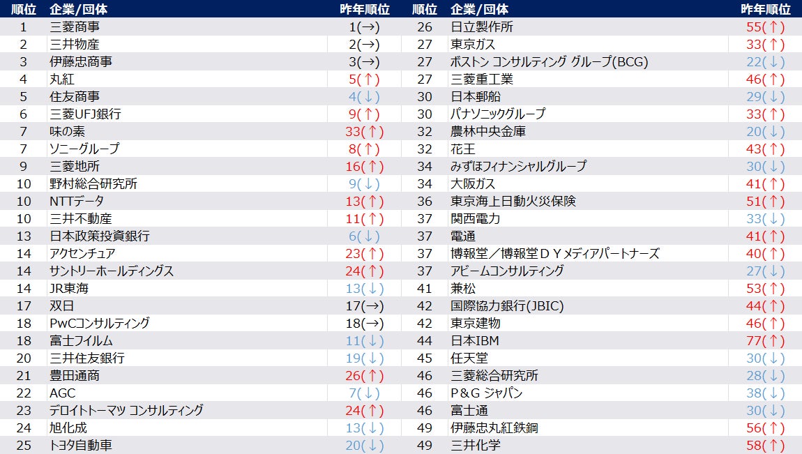 例年通り総合商社が上位にランクインし堅実な人気。専門商社も順位を伸ばす。