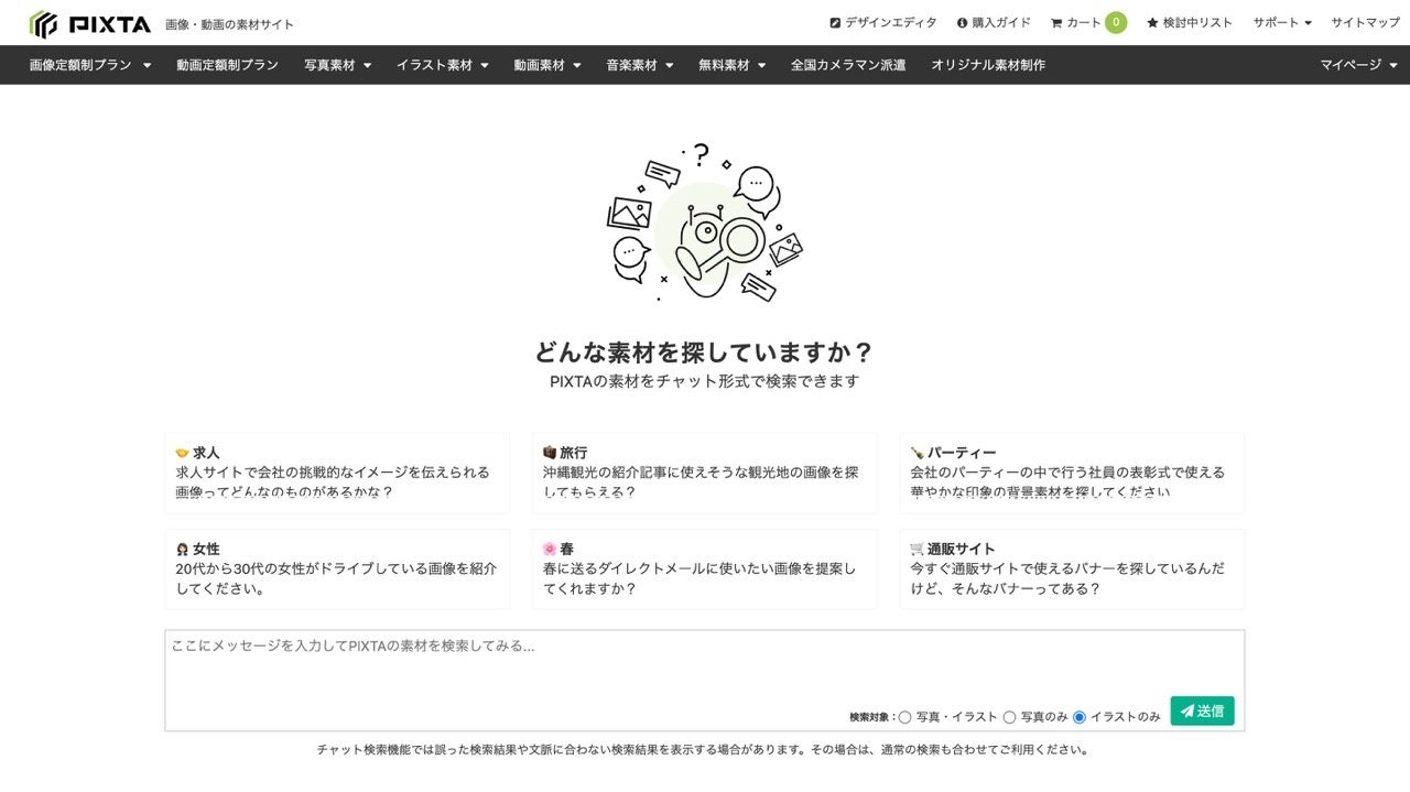 「PIXTA検索アシスタント」は、チャット形式でPIXTAの写真・イラスト素材を探せる、OpenAI APIを用いた新しい検索機能です。