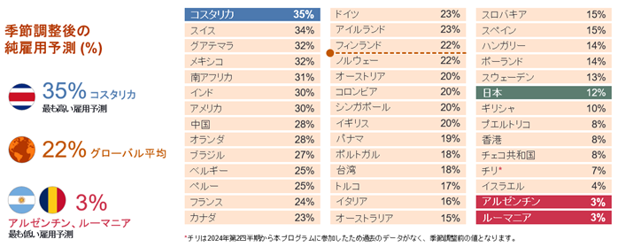 純雇用予測は、42カ国・地域のうち全ての国・地域がプラスと回答しています。日本の雇用意欲は、前四半期比1ポイント増、前年同期比では1ポイント減の結果となりました。
