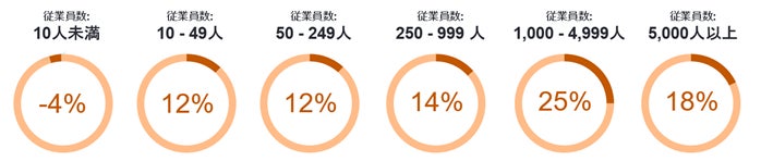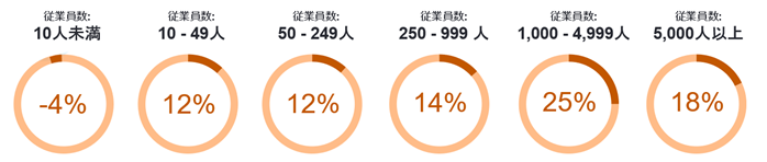 日本国内の組織規模別調査では、従業員数10人未満を除く、5つの組織規模で増員予定となっています。従業員数1,000-4,999人の組織が、前四半期比2ポイント増の純雇用予測+25%となり、最も高い雇用予測です。