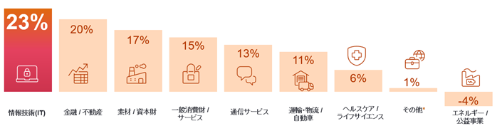 日本国内の業種別調査では、調査対象の9業種中、8業種で増員予定となっています。最も活発な雇用活動が期待されるのは、「情報技術」で、前四半期比5ポイント減の純雇用予測+23%です。