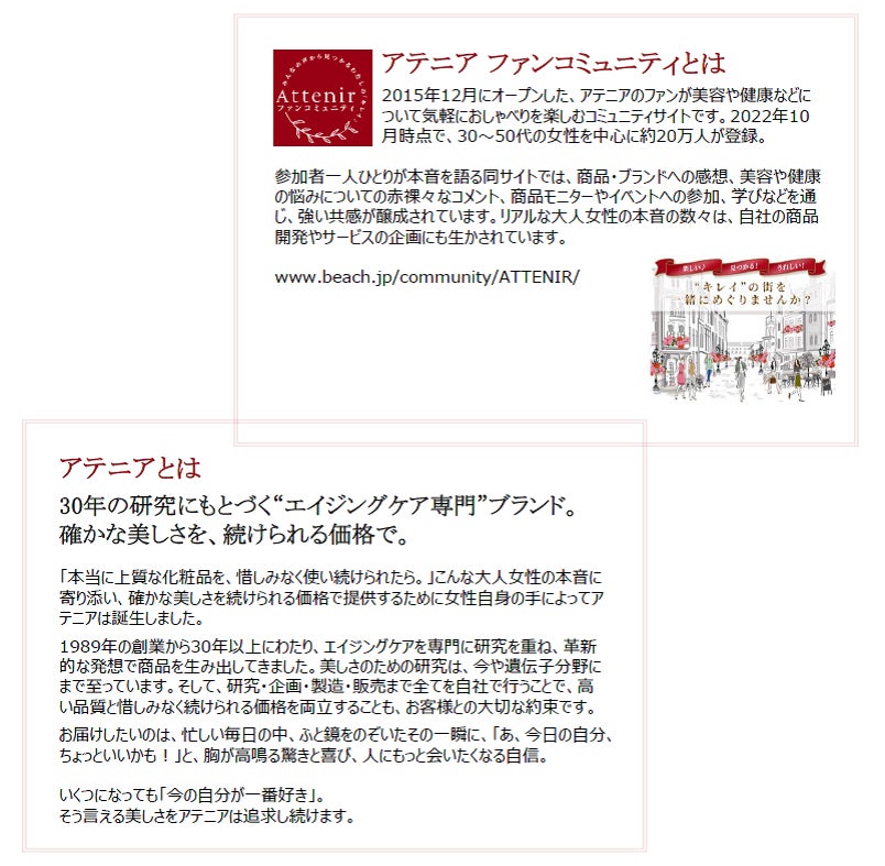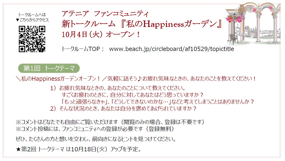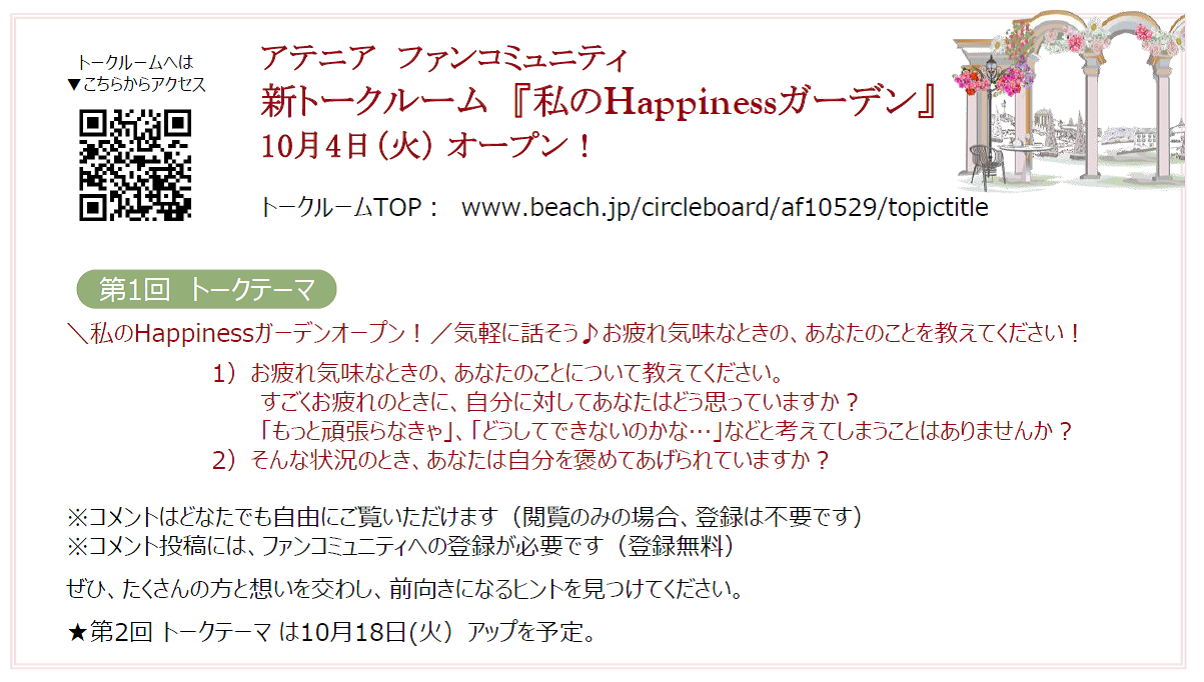 まずは、30~50代の女性を中心に20万人の登録者が集い、本音を語りあう、当社のコミュニティサイト「アテニア ファンコミュニティ」内に、新トークルーム『私のHappinessガーデン』を10月4日(火)、オープンいたします。