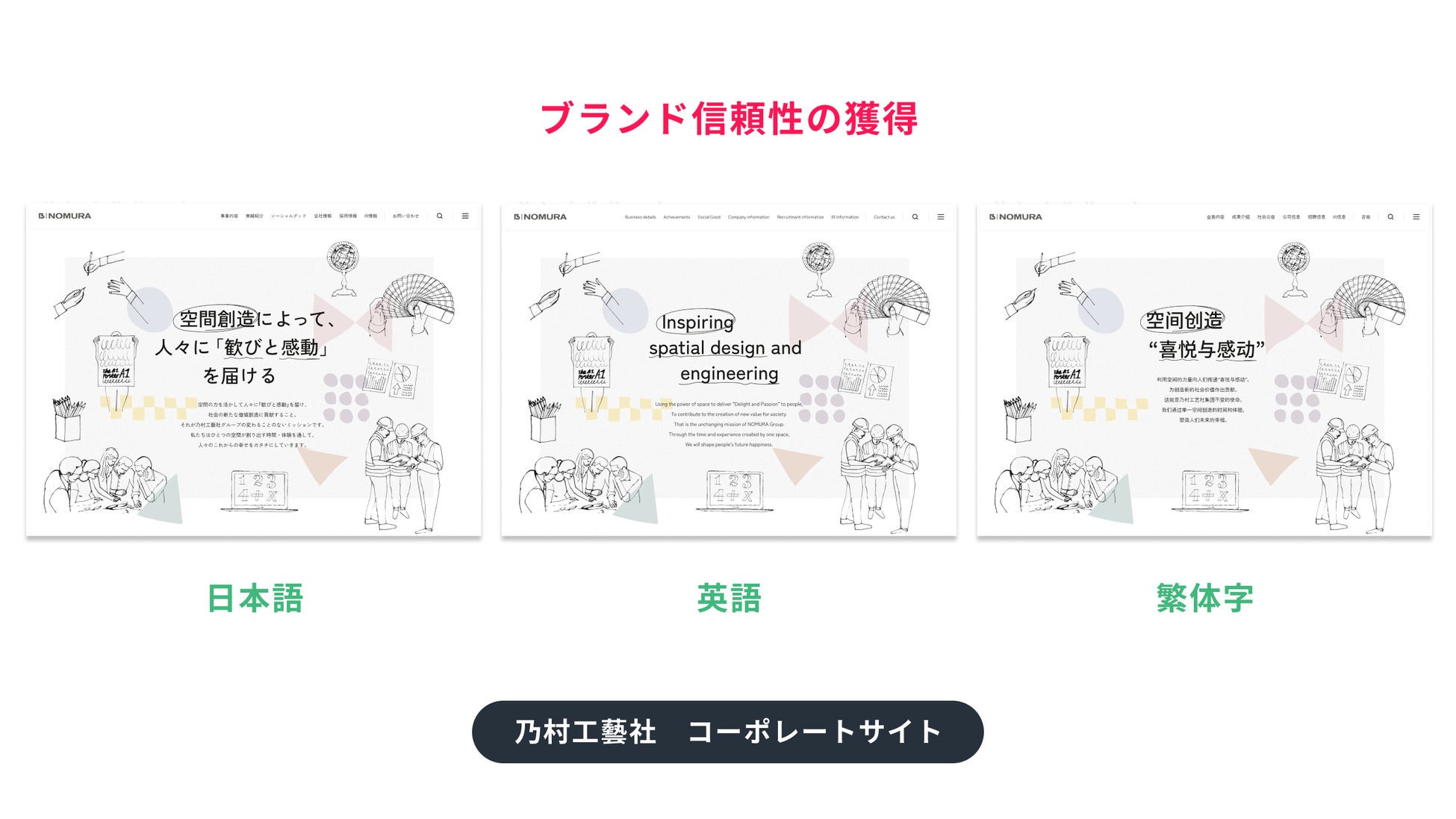 実績を掲載するだけでは伝えきれない、乃村工藝社の各プロジェクトに込められた思いや裏側を、空間づくりのプロフェッショナルたちが発信しています。英語対応により、海外の方にもプロジェクトや取り組みに対しての理解を深めていただき、企業としての信頼を得られるようなサイトづくりを目指します。