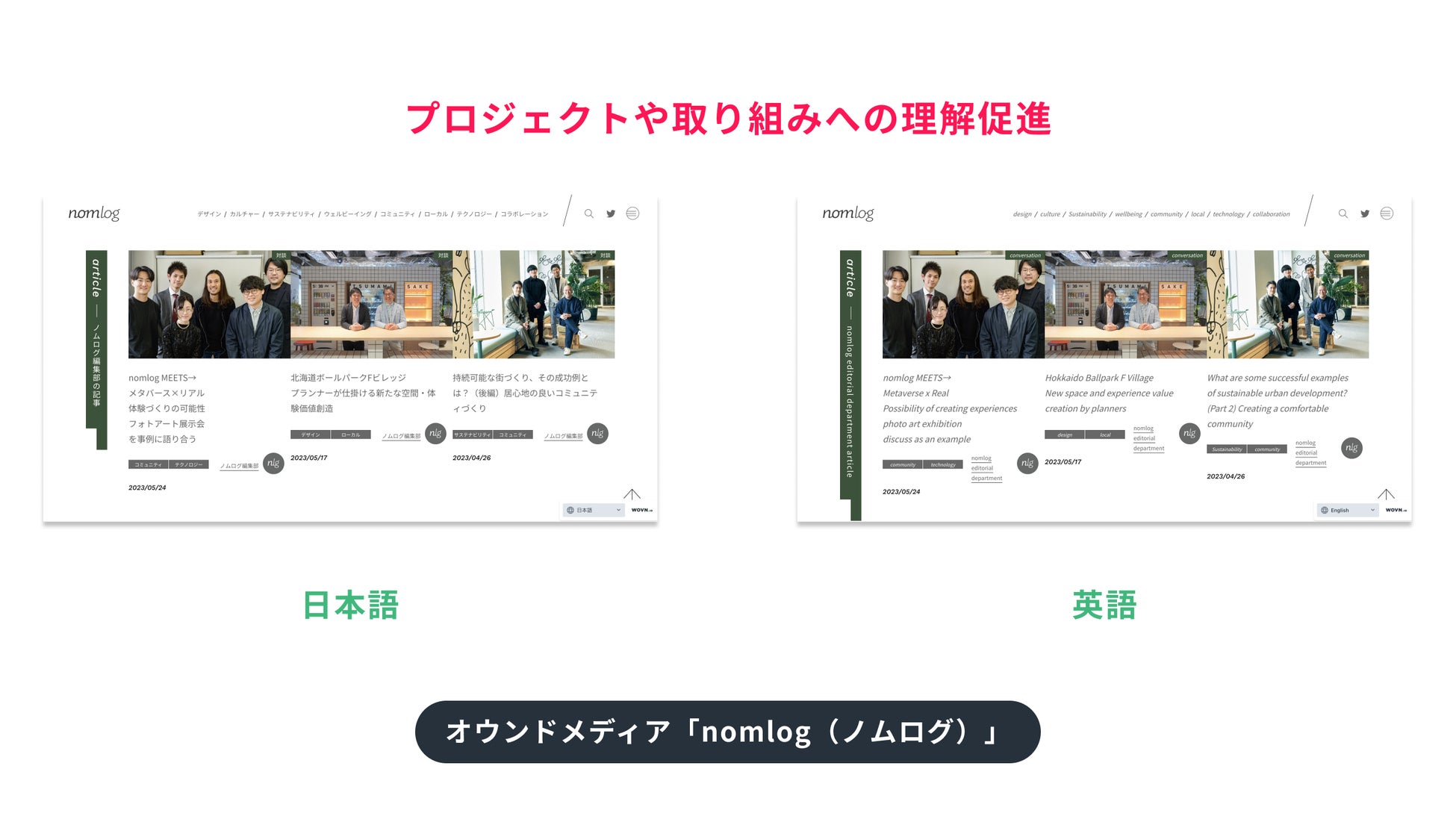 また、コーポレートサイトを WOVN.io で多言語化したことをきっかけに、これまで日本語のみで発信していたオウンドメディア「nomlog(ノムログ)」の英語対応も実施しました。写真による実績紹介だけではイメージしづらいプロジェクトの裏側や取り組みの詳細を、乃村工藝社にいる空間づくりのプロフェッショナルである社員の生の声を通して、海外へ発信していきます。