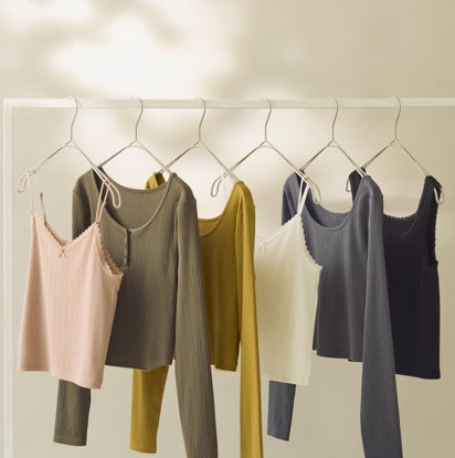 コットンブレンドリブインナーは全6型となり、レギュラー丈のほか、トレンドのクロップド丈はヘルシーな肌見せスタイリングにぴったりの1枚です。見せてもおしゃれなヘンリーネックやデコルテがきれいに見えるワイドネックタイプは、レイヤードやアクセサリーで自由な着こなしを楽しめるアイテムです。