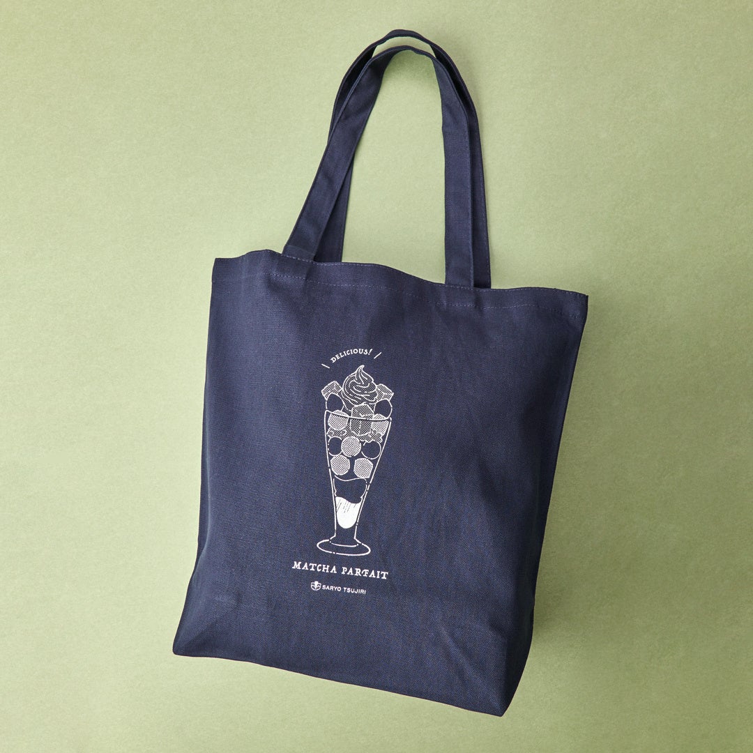 茶寮都路里の人気メニュー「特選都路里パフェ」をイラスト化したレトロ可愛いオリジナルトートバッグ。昨年、好評だったホワイトカラーがアップデートし、2024年版としてネイビーの限定色が登場いたします。