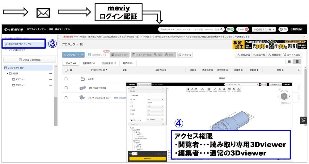 この機能では、meviyにアップロードした機械部品の設計、見積もり情報を社内や協力会社の関係者に共有でき、meviyの3Dビューワー上で詳細の確認や編集を共同で行えるようになります。