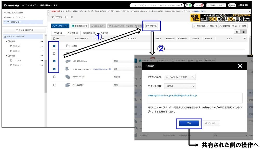 ①フォルダ/プロジェクトにチェックを入れて共有するボタンをクリックします。