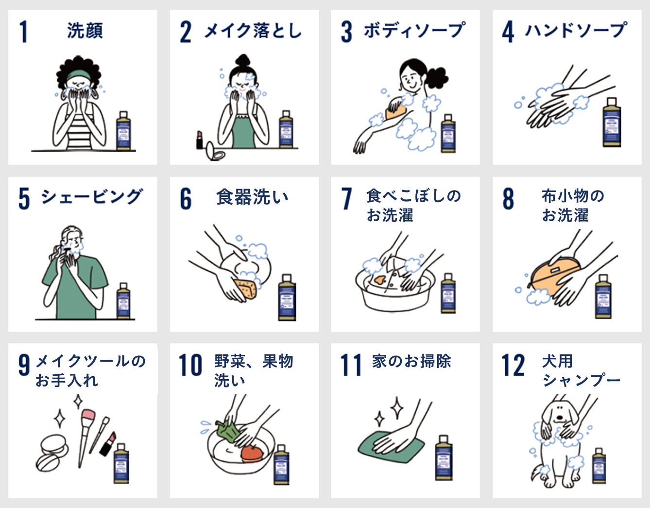 天然の洗浄成分が濃厚なため、合わせる水の量によって、様々な用途に使用できます。