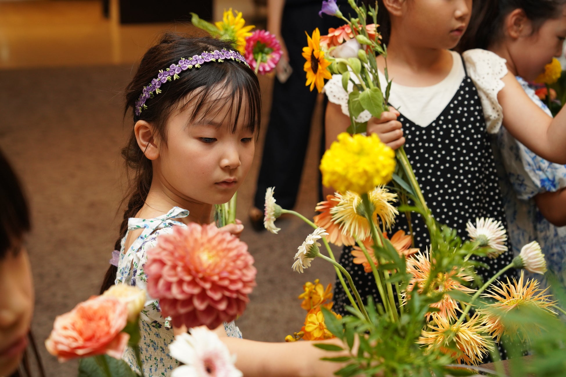 「挙式体験」では、結婚式の進行のアナウンスや、指輪、ブーケといったアイテムを運ぶなど、子どもたちが結婚式場のスタッフ役として様々な役割を果たしながら、協力して結婚式を作りあげます。その他、「パティシエ体験」でのミニケーキのデコレーションや、「フラワーコーディネーター体験」でのブーケづくりで、働くことの楽しさを伝え、子どもたちの職業観を育みます。ブーケづくりで使用する生花は、プランツパートナー※に協力いただき、ロスフラワーを使用。会場によって実施内容が異なるため、詳細は公式サイトをご覧ください。
