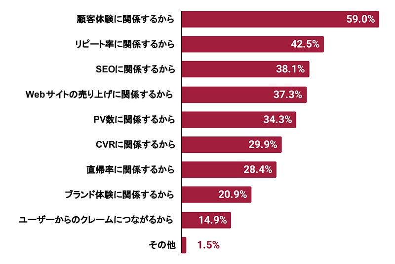 SEO担当者(SEOを担当領域とする回答者)に限定して、表示速度の重要性の認識について尋ねたところ、非常に興味深い結果が出ています。重要性を認識している理由として、「SEO」との関係性よりも「顧客体験」「リピート率」との関係性を挙げる人が多いのです。顧客体験がSEOにとって重要であることを前提として、より広い視野でWebサイトの表示速度に向き合っていることがわかります。そもそも表示速度とSEOの関係性が急速に注目され始めたのは、Core Web Vitalsがランキングシグナルに採用されてからのこと。Core Web Vitalsはユーザー体験を定量化した指標です。「表示速度の改善=検索順位の上昇」という短絡的な思考ではなく、本来の意味を正しく理解している人が多い証拠かもしれません。
