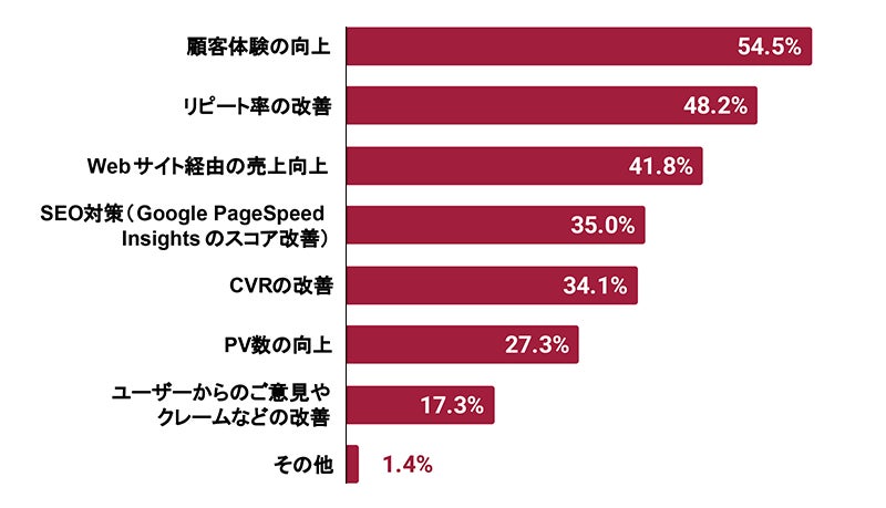 表示速度改善への取り組み経験を尋ねた結果、7割以上が表示速度改善に関心を持っていることがわかっています(「過去に取り組んだことがある」「現在取り組んでいる」「今後取り組もうと考えている」の合計)。表示速度の改善に取り組んだ・取り組む目的については、「顧客体験の向上」が54.5%と最も多い結果に。「リピート率の改善」や「Webサイト経由の売上向上」にも回答が集まっています。