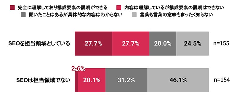 Core Web Vitalsは、Googleの検索順位に影響するユーザー体験を測る指標です。Webサイトの表示速度はCore Web Vitalsに影響を与えています。このCore Web VitalsについてSEO担当者に尋ねると、「完全に理解しており構成要素の説明ができる」と回答した人は27.7%。全体の約4分の1にとどまりました。表示速度の重要性を強く認識しているはずのSEO担当者でも、7割以上がCore Web Vitalsについて、説明できるほどには理解できていないのです。重要性の認識とそれに対する知識の乖離が発生しているといえそうです。