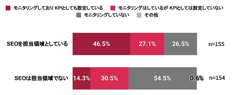 SEO担当者の表示速度改善への取り組み経験を調査すると、「過去に取り組んだことがある」が22.6%、「現在取り組んでいる」が40.6%と、改善に取り組んだことがある人は6割以上となっています。さらに、SEO担当者のうち「表示速度をモニタリングしておりKPIとしても設定している」と回答したのは46.5%、「モニタリングしているがKPIとしては設定していない」が27.1%となりました。