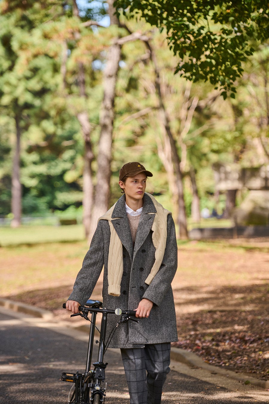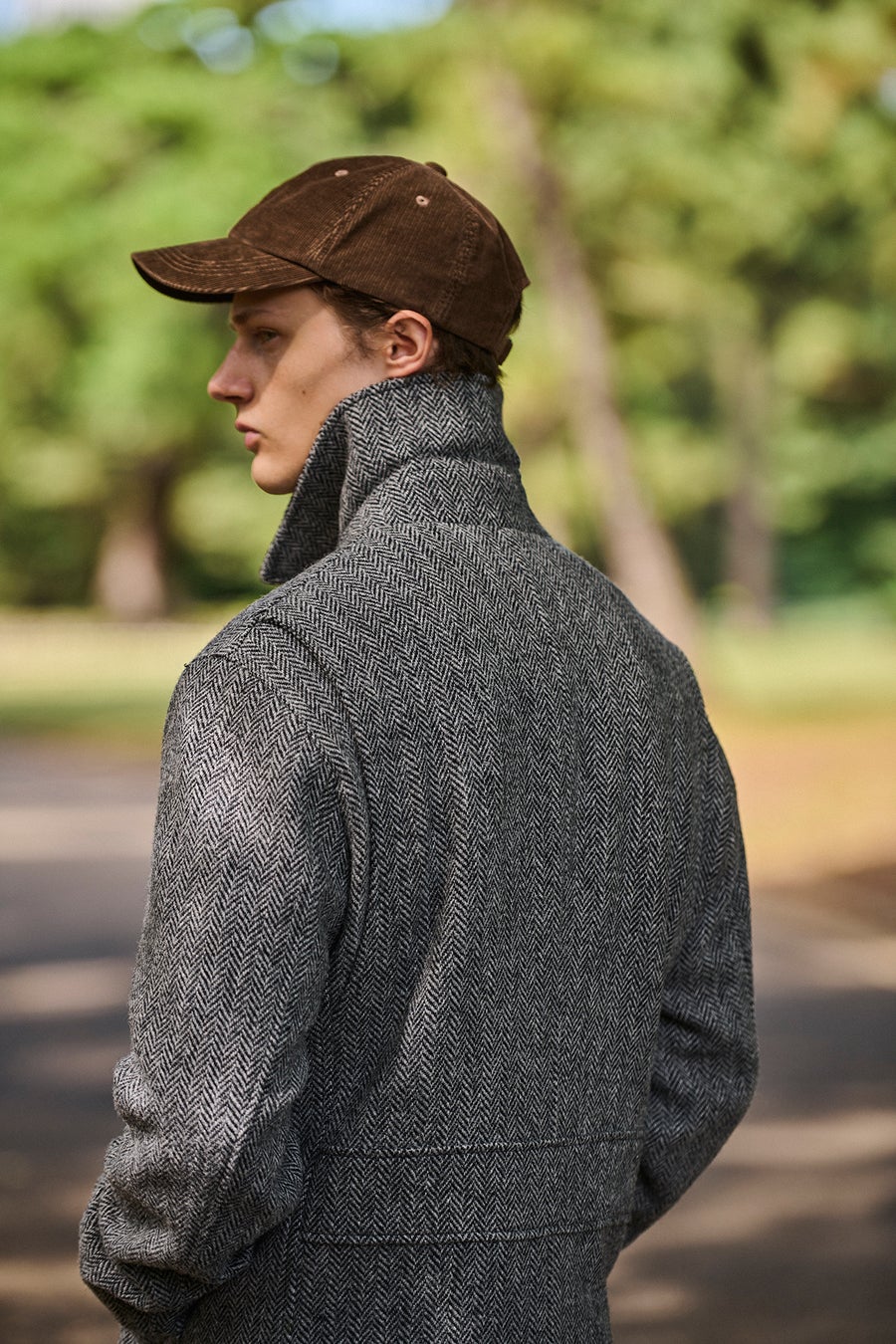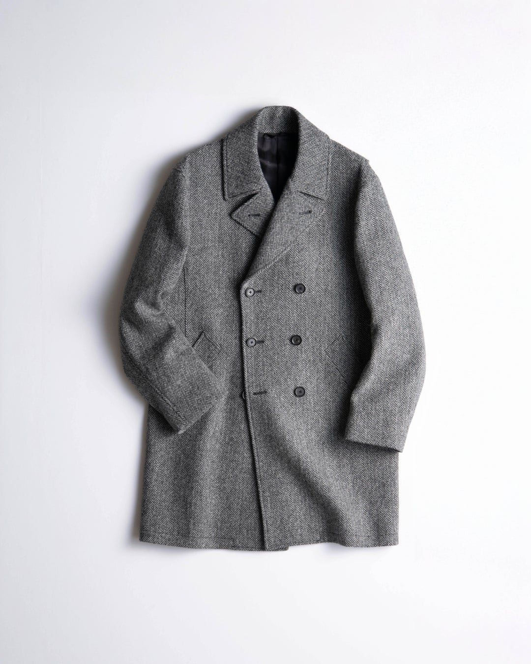 吉野さんがセレクトしたのは、北アイルランドのアルスター地方が起源とされるアルスターコート。ダブルブレストの重厚なフロントと、上衿と下衿が同等のサイズで仕立てられたアルスターカラーが特徴。生地には、スコットランド・ハリス島とその周辺の限られた地域で、伝統的な手法によって織り上げられたハリスツイードを使用。ブラック/ホワイトの糸を複雑に織り上げることで表現されたグレーのヘリンボーン柄は奥深い色合いを宿し、時を重ねるごとに味わい深い経年変化をお愉しみいただけます。卓越した耐久性と防寒性を備え、永年の着用に耐えうる一着です。