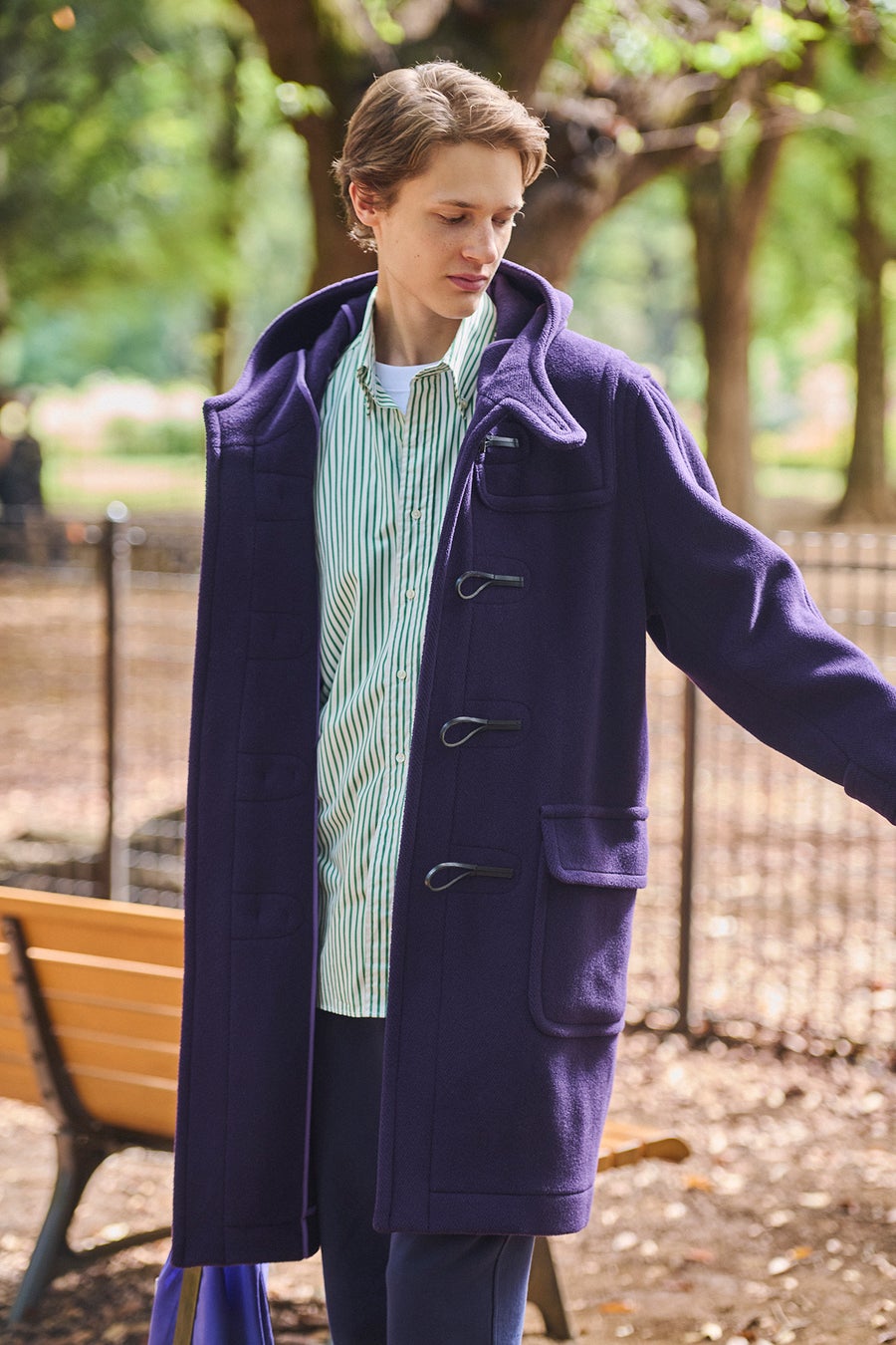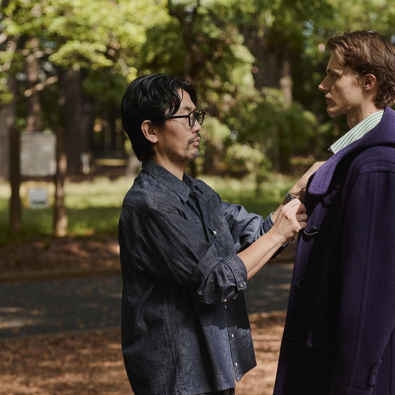荒木さんがセレクトしたのは、英国の伝統とクラフトマンシップに現代的な感性を融合させた本格派ダッフルコート。ブルックス ブラザーズが90年代に販売していた、チンストラップ一体型ダッフルコートのディテールとシルエットを踏襲。生地には、英国MALLALIEUS社のカットパイルヘリンボーン生地を使用。同社が所有する、世界に数台しか現存しない旧式織機でゆっくりと織られた3層構造の生地は、しっかりとした厚みがありながら軽く柔らかい独特の質感が特徴です。表面の織糸をカットすることで表現されたヘリンボーン柄は繊細な立体感があり、クラシックスタイルのダッフルコートにふさわしい確かな品格を感じさせます。英国の重衣料専門ファクトリーにて、熟練の職人が伝統的な縫製技術により、一着ずつ丁寧に縫製しました。