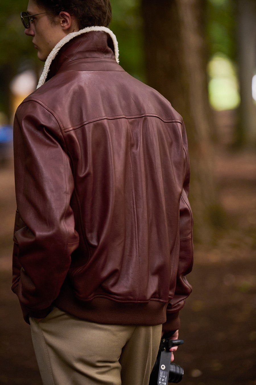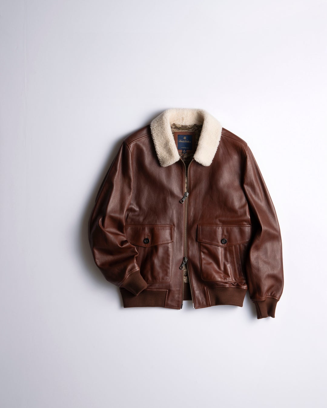 四方さんがセレクトしたのは、ウォッシュをかけたソフトなラムレザーを使用しクラシカルに仕上げたフライトジャケット。1930年代のアメリカ空軍のフライトジャケットA-2モデルをベースに、柔らかなラムレザーを使用しています。ヴィンテージミリタリー調の無骨さを残しつつ、上品な雰囲気を纏ったデザインです。特徴的な2つのフラップパッチポケットは、実用的なハンドウォーマーポケット付きにアレンジ。カジュアルはもちろん、タイドアップスタイルにも合わせやすく、普段のスタイルにラフに羽織っていただくだけでもサマになるレザージャケットです。