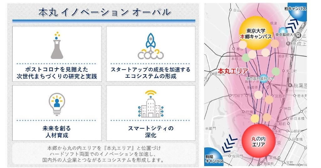 MEC-U Tokyo Labは、東京大学の主要拠点であり卓越した知が集積する本郷から、三菱地所が130 年以上にわたりまちづくりを推進する大手町・丸の内・有楽町までのエリア(以下、「本丸エリア」)に集積する企業等と東京大学との協業を通じて、次世代のまちづくりのあるべき姿の探求や、新たな産業の創出、社会課題解決の取り組みを推進することで、イノベーションが創出され成長するまちへの進化を目指しております。