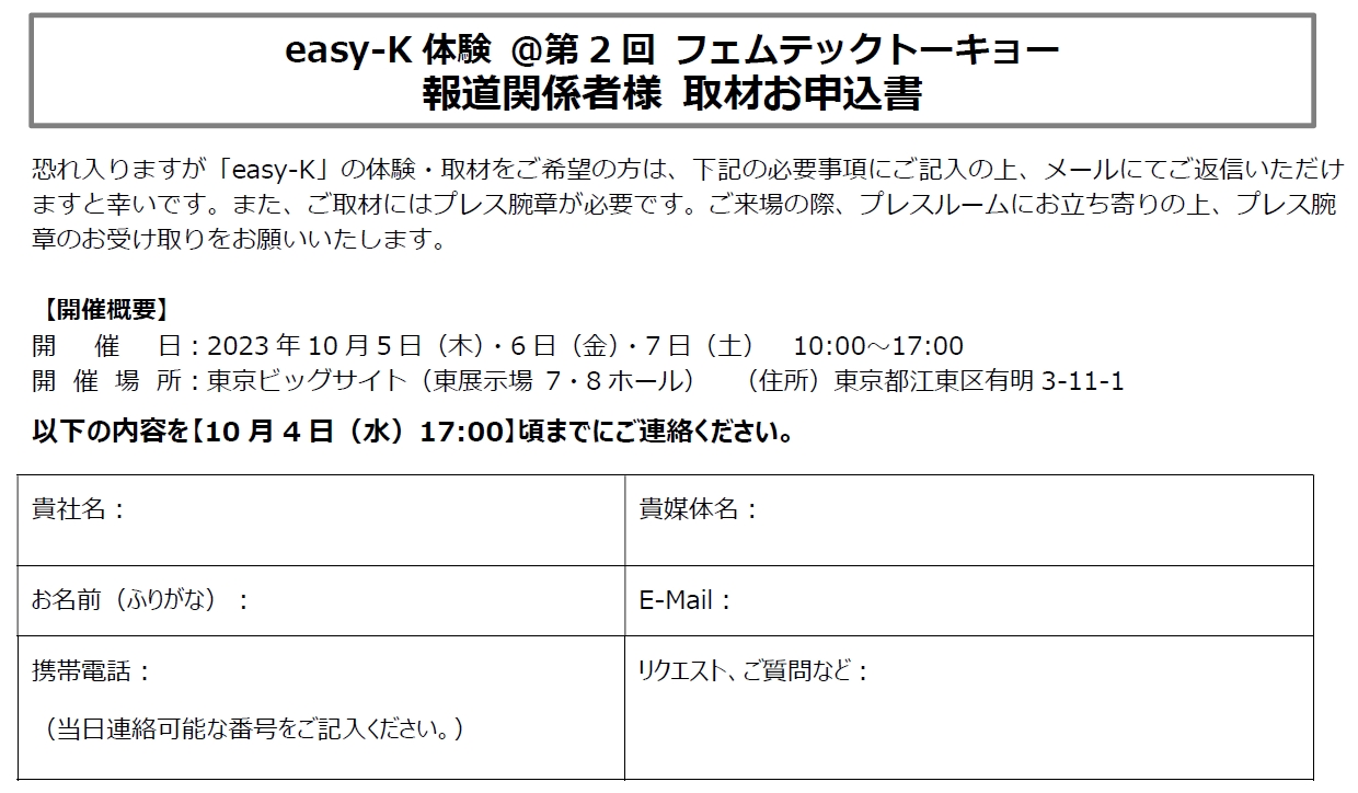 「easy-K」は、韓国の大学機関で2年以上の研究を費やして開発されました。さらに、韓国では約100億円を売り上げ※満を持して日本に上陸、プライムダイレクトで取り扱うことになりました。この度、東京ビッグサイトで開催される「第2回 Femtech Tokyo」で初めて「easy-K」を体験できるブースを出展します。