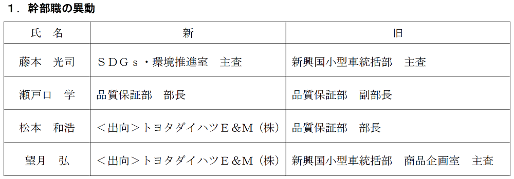 ダイハツ工業(株)は、2022年4月1日付で下記の通り、幹部職の人事異動を行います。