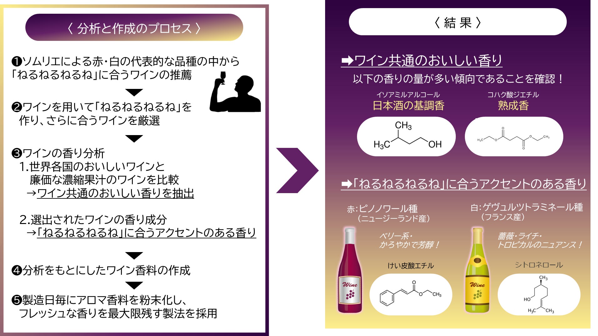 ・ソムリエが赤・白それぞれの代表的な品種ごとに「ねるねるねるね」に合うワインを推薦。さらに実際にワインを用いて、「ねるねるねるね」を作り、1番合うものを厳選。選ばれたワイン分析をもとに調合したアロマ成分を配合。