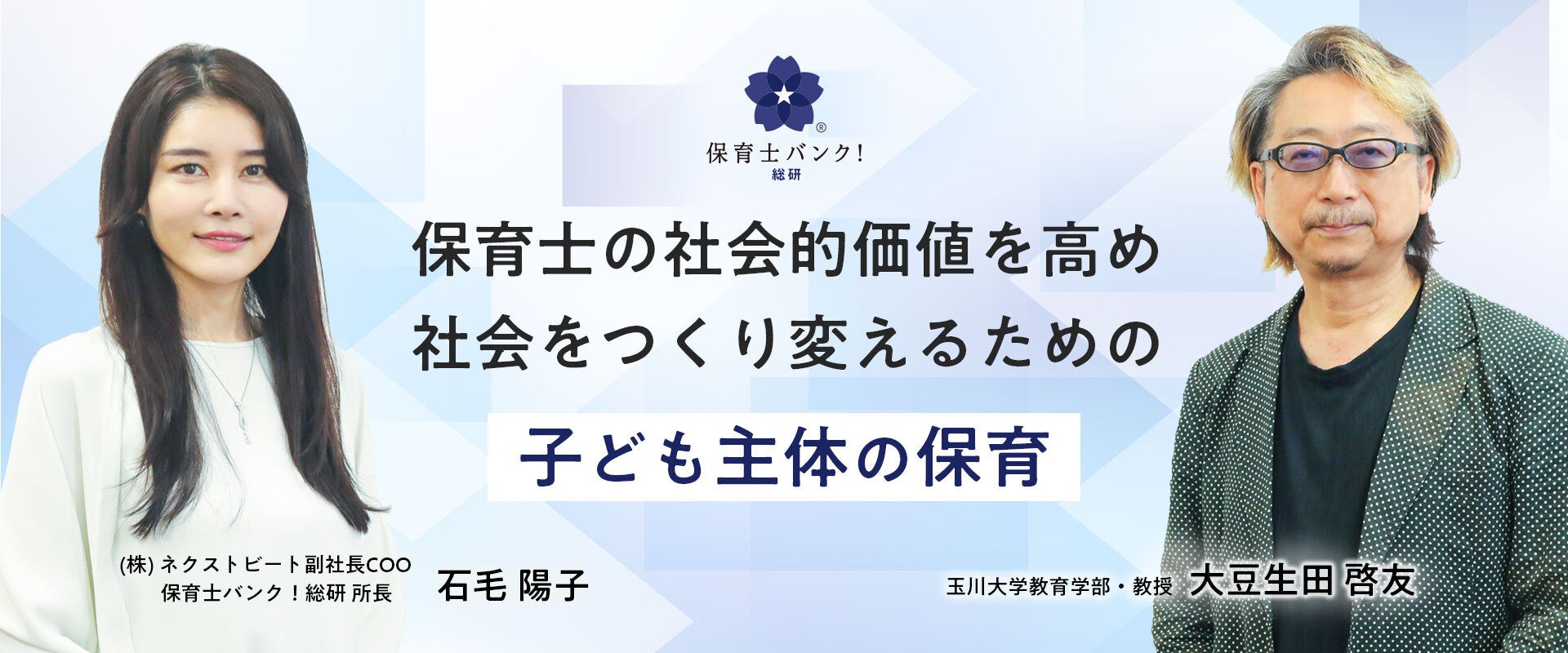 【概要】 保育業界を牽引している大豆生田啓友先生に「子ども主体の保育」を軸にしたお話を伺いました。子どもと社会の距離感、保育士の社会的価値、保育業界から見える日本社会の未来とは。 本企画を通して、今後の「保育」について考えるきっかけになればと考えております。 最後に、現役保育士から集めた質問にも、お答え頂いております。 聞き手:保育士バンク!総研 石毛、清末 ※役職は2023年9月末時点 |