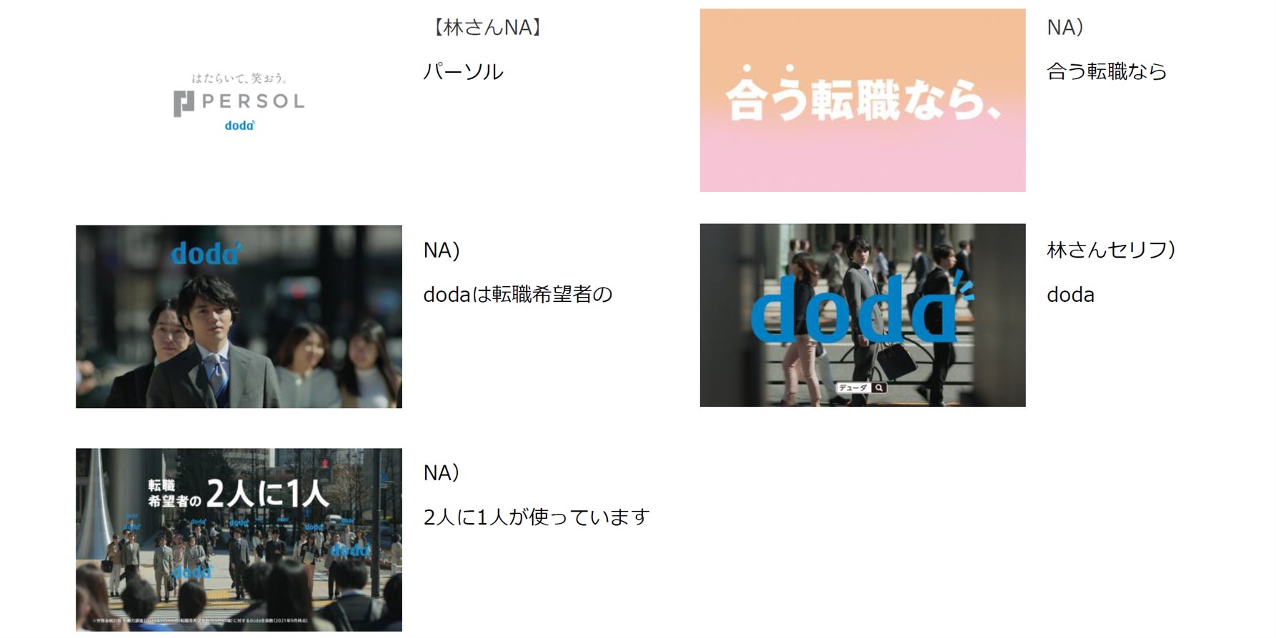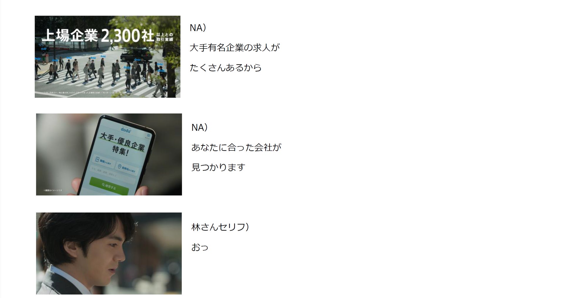4月8日より放映開始の新TVCM「合う転職なら」篇(大手有名企業の求人多数)では、取り扱っている上場企業2,300社をはじめとした大手有名企業、優良企業の中からさまざまな求人を見つけられるdodaの特徴を表現しています。「自分に合ったはたらき方や条件に合った企業をdodaなら見つけられる」ということを、林 遣都さんが演じる転職希望者の行動や表情、「“合う”転職なら」というメッセージとともに視覚的に表現しています。