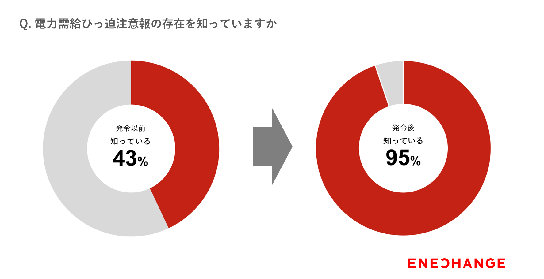 - 初回発令後に電力需給ひっ迫注意報の認知度は95%に増加