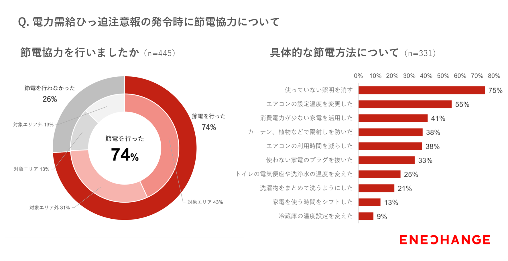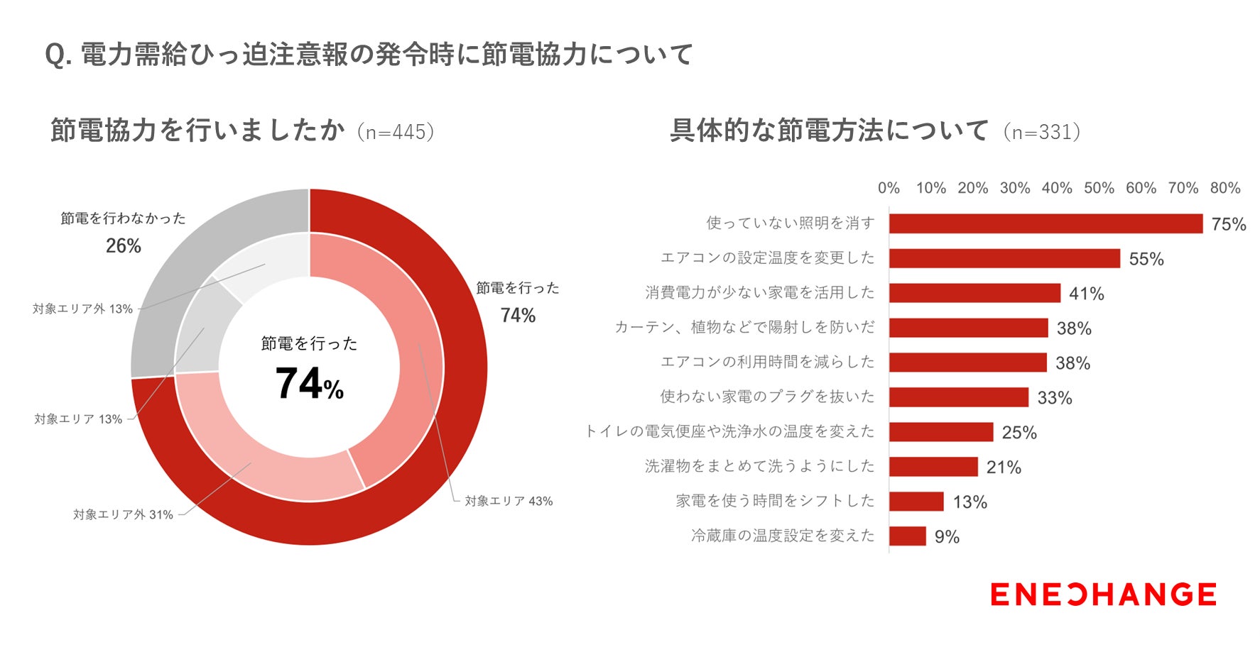 - 電力需給ひっ迫注意報発令時、対象エリア内外を含めて74%が節電に協力