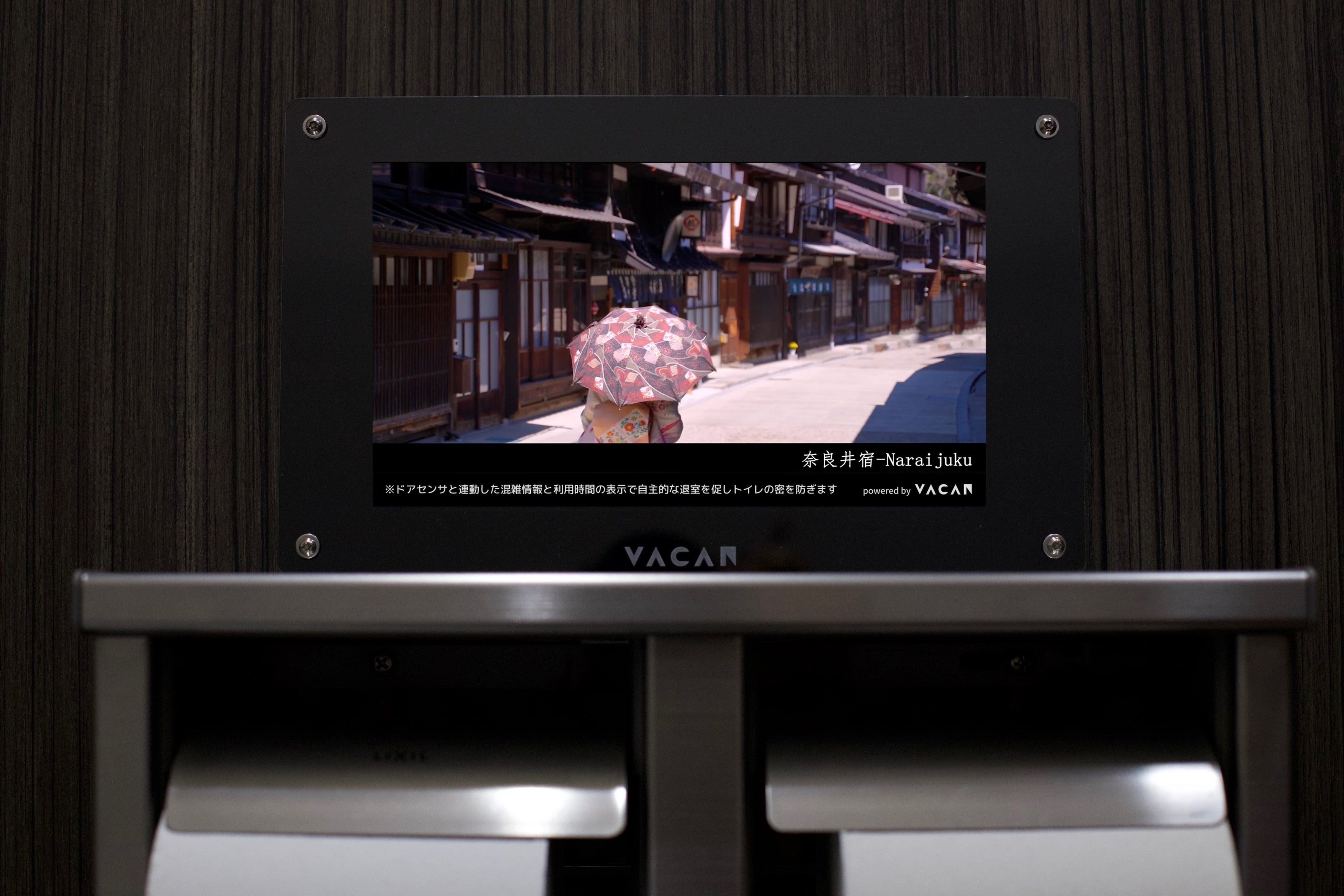混雑具合に応じて広告の長さを自動で調整したり、滞在時間に応じて画面の表示を滞在抑制につながる表示に変更するといった、バカンがこれまでに蓄積してきた技術やノウハウから生み出した特許技術(出願中含む)が多数用いることで、トイレの混雑抑制とメディア化を実現しています。