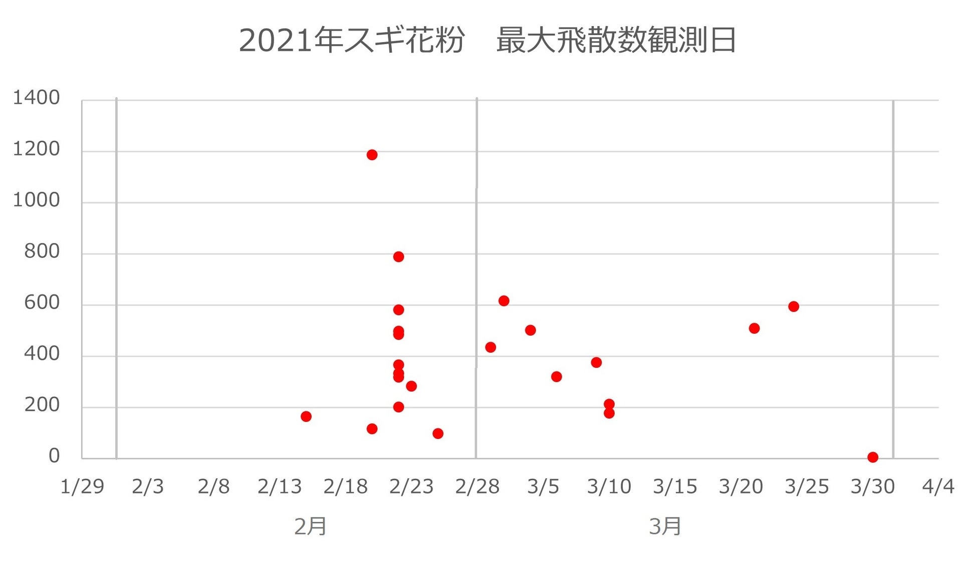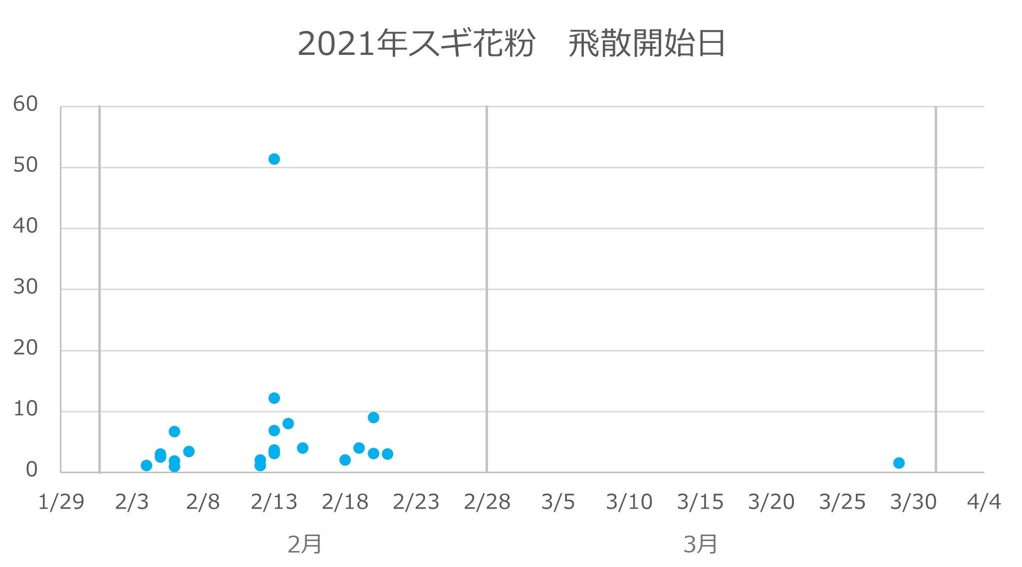 環境省のデータによると、2021年に計測した全国の主要都市のうちの95.8%は、2月中に「飛散開始日」を迎えています。