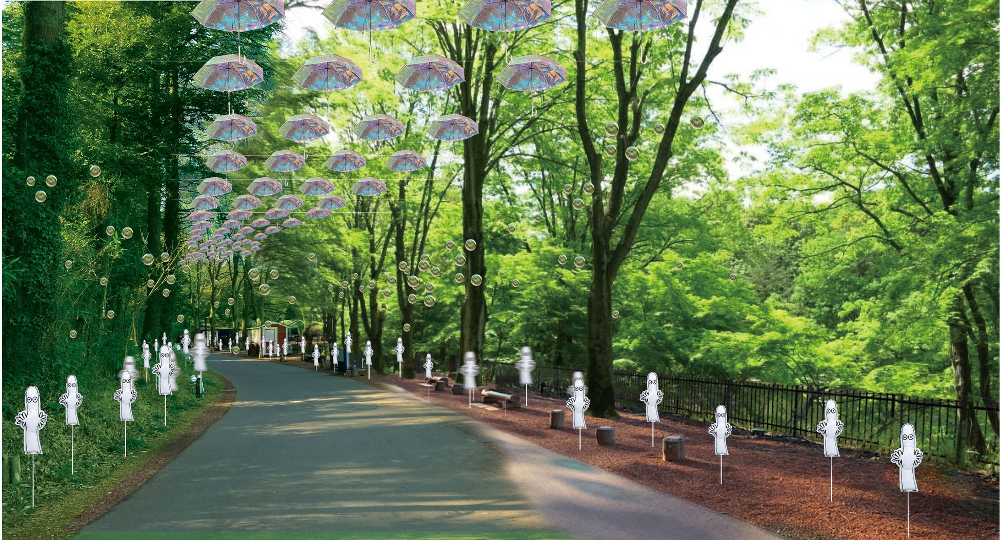 2023年の新たな試みは、シャボン玉の演出と、トレンドのオーロラ素材を使用したアンブレラです。太陽の光によって複雑な色合いを作り出すアンブレラのアーケードの下を、ふわふわとシャボン玉が漂い、虹色に輝く幻想的な光景が楽しめます。