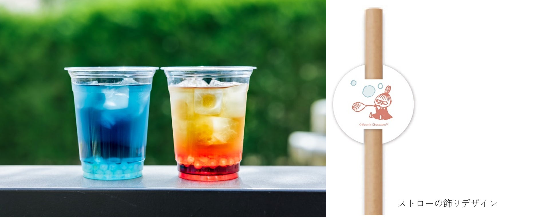 イベント限定メニューには、色鮮やかな2種類のティードリンクが登場します。バタフライピーを使用したさわやかな味のDAYバージョンと、ラズベリーのすっきりしたSUNSETバージョンは、昼間の青空とあかね色の夕焼け、時間の経過によって表情を変えていくカラフルなアンブレラスカイをイメージしています。ストローにはリトルミイの飾り付きで、ロゴのしゃぼん玉をイメージしたタピオカも入っています。どちらもこれからの季節にぴったりです。