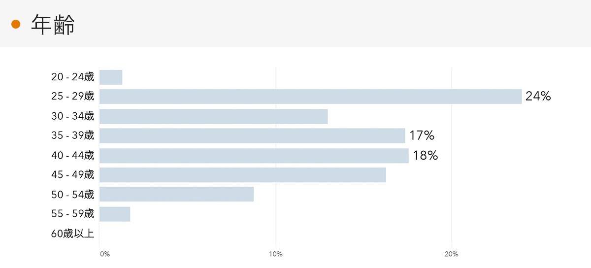 最も割合の多い年齢帯は25〜29歳で24%(前月比1ptアップ)、次に多い割合は40〜44歳の18%、続いて35〜39歳の17%となります。