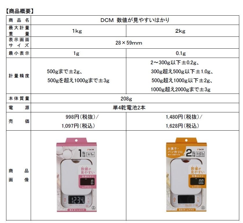 全国でホームセンター事業を展開するDCM株式会社(東京都品川区、代表取締役社長: 石黒靖規以下、DCM)は、重量などの情報を白色文字で表示することで、薄暗いところでも見やすい「DCM数値が見やすいはかり (1 kg対応・2kg対応) 」を、2022 年8月12日(金)より全国のDCMグループ店舗(DCM・DCMカーマ・DCMダイキ・DCMホーマック・DCMサンワ・DCMくろがねや及びケーヨーデイツー、一部店舗を除く)にて発売します 。