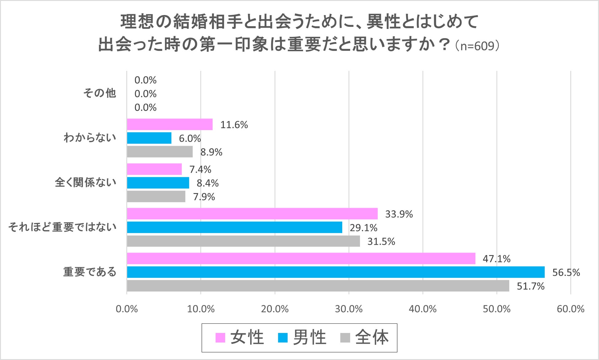 結果は男女あわせて51.7%が「重要である」という回答で、男性では56.5%、女性では47.1%が重要であるという回答で、既婚の男女の約半数が経験上の認識として、結婚相手と出会うために第一印象は重要であるという認識を持っていることがわかりました。