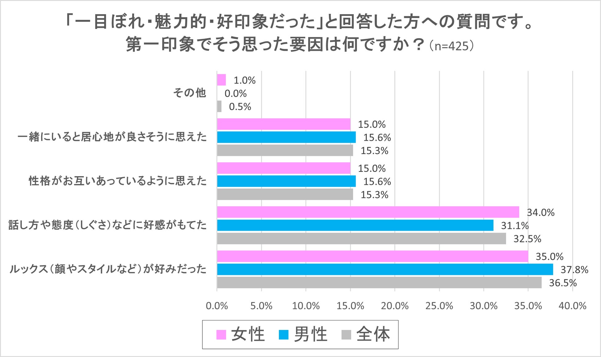 回答として最も多かった回答は、男女ともに「ルックス(顔やスタイルなど)が好みだった」で、全体で36.5%、男性37.8%、女性35.0%という男女ほぼ同割合という回答結果となりました。次に多かった回答は、「話し方や態度(しぐさ)などに好感がもてた」という回答で、全体で32.5%、男性31.1%、女性34.0%という結果となりました。3番目に多かった回答は、「一緒にいると居心地が良さそうに思えた」と「性格がお互い合っているように思えた」が全く同数回答となり、全体が15.3%、男性が15.6%、女性が15.0%という結果となりました。