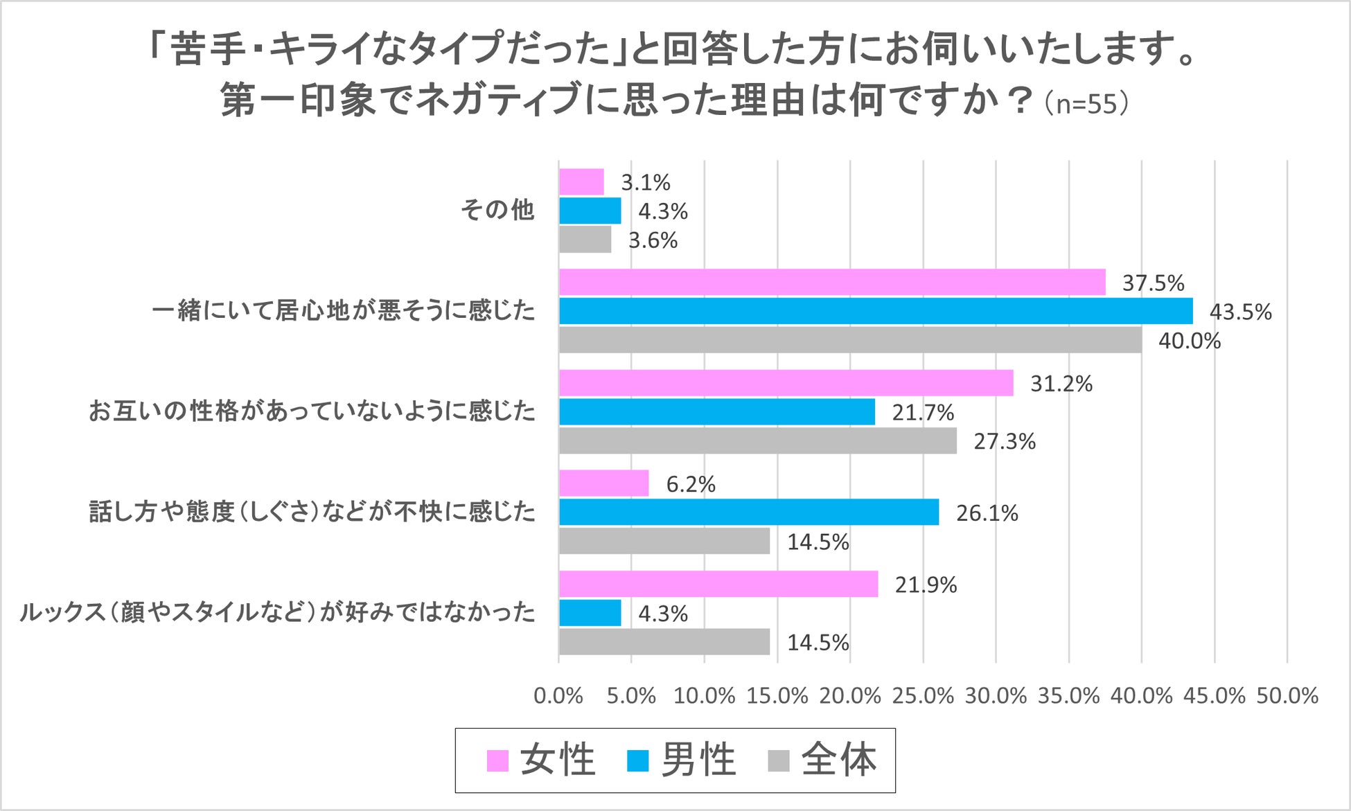 第一印象で異性に対してネガティブに感じてしまう要因としては、一緒にいることの居心地の悪さやお互いの性格があわないと感じることが影響することがうかがえます。一方で今回の調査対象が既婚の男女であることから、そういったネガティブな第一印象であっても、その後の二人の状況によってはお付き合いから結婚に至るということもいえることが調査結果に表れる結果となりました。第一印象がネガティブであっても、その後じっくりとお相手とお付き合いするうちに人生における大切なパートナーとなる関係性に発展する可能性があるということがわかる回答結果となりました。