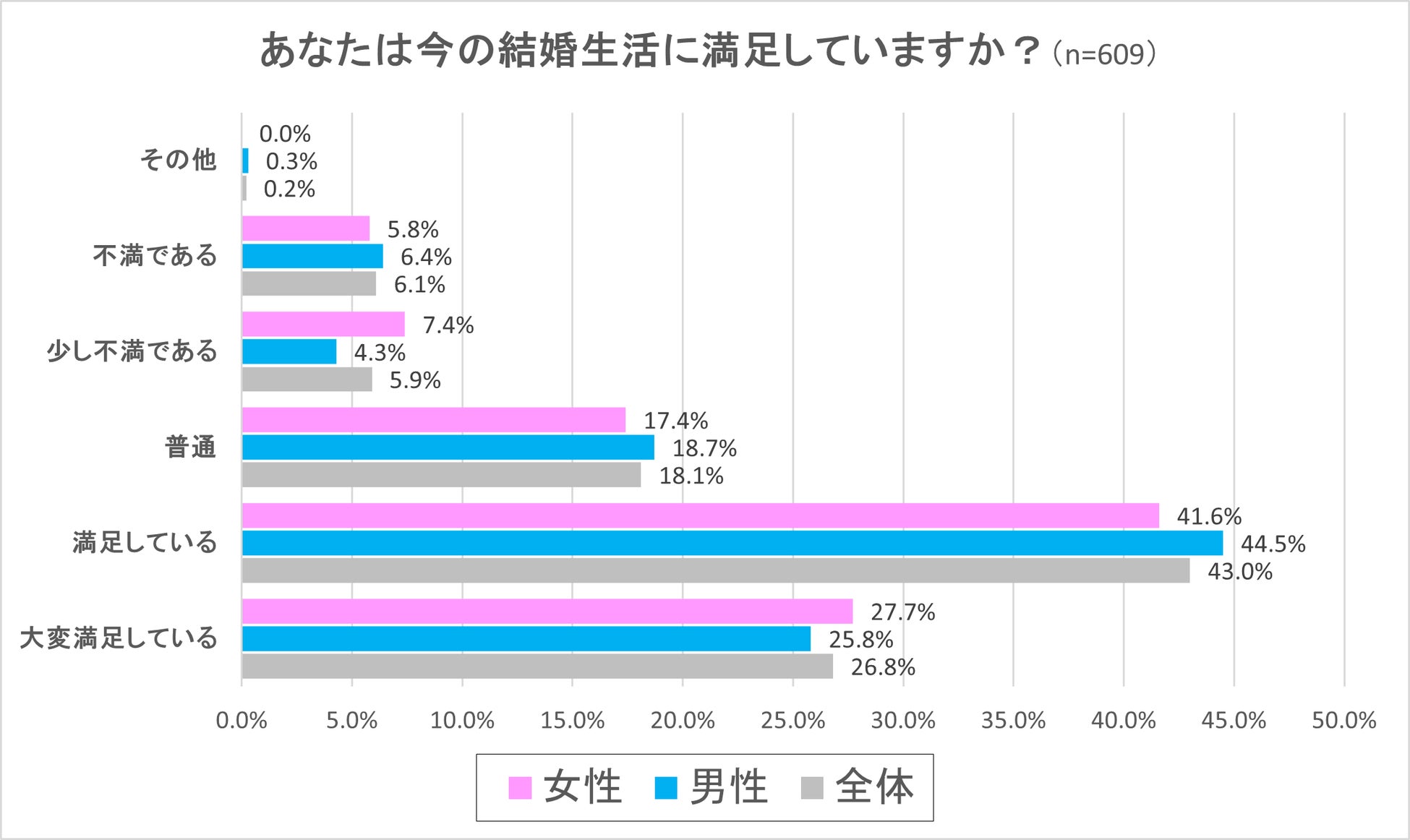 最後の設問では今回の調査対象全員の方に、今の結婚生活に満足していますか?という質問をしてみました。その結果全体の26.8%が「大変満足している」、43.0%が「満足している」、そして18.1%は「普通」という回答結果で、全体で87.9%の男女が結婚生活に対して思い描いた範囲内であるということがうかがえる回答結果となり、出会った当初はそれぞれいろいろな第一印象を持ちながらも、その後のお付き合いを経てお互いを理解し、全体の9割の方が想定した範囲内の結婚生活を送っていることがわかる調査結果となりました。