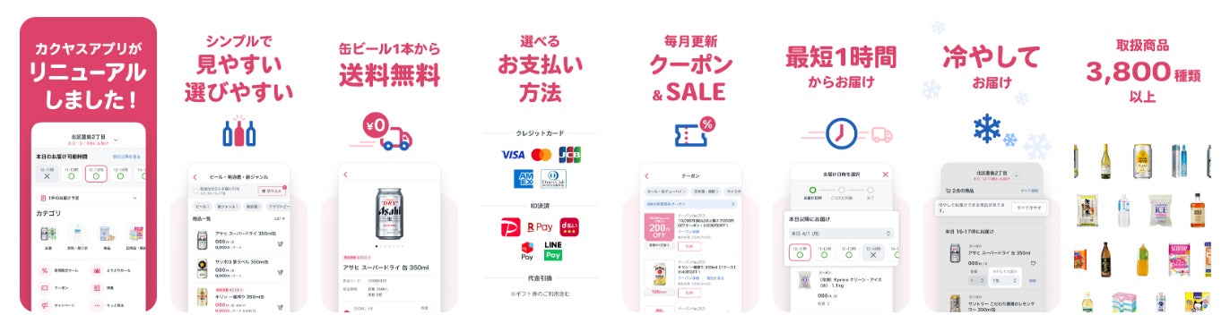 「カクヤス公式アプリ」は今回のリニューアル※1により、近隣のカクヤス店舗から送料無料で1時間単位の時間指定でお届けする「店舗からお届けサービス」に特化したアプリとして生まれ変わりました。※2ユーザーの声をもとに、商品の選択から注文完了までをシンプルでストレスなく行えるようデザインを一新しました。また、ご要望の多かった、過去に購入した商品を簡単に再注文できる機能も追加しました。今後もより多くのお客様に「カクヤス公式アプリ」をご利用いただけるよう随時アップデートを行ってまいります。