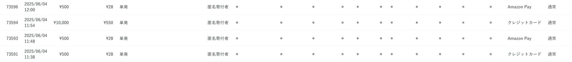 寄付履歴画面と寄付履歴CSVに寄付された金額と日時は表示されます。