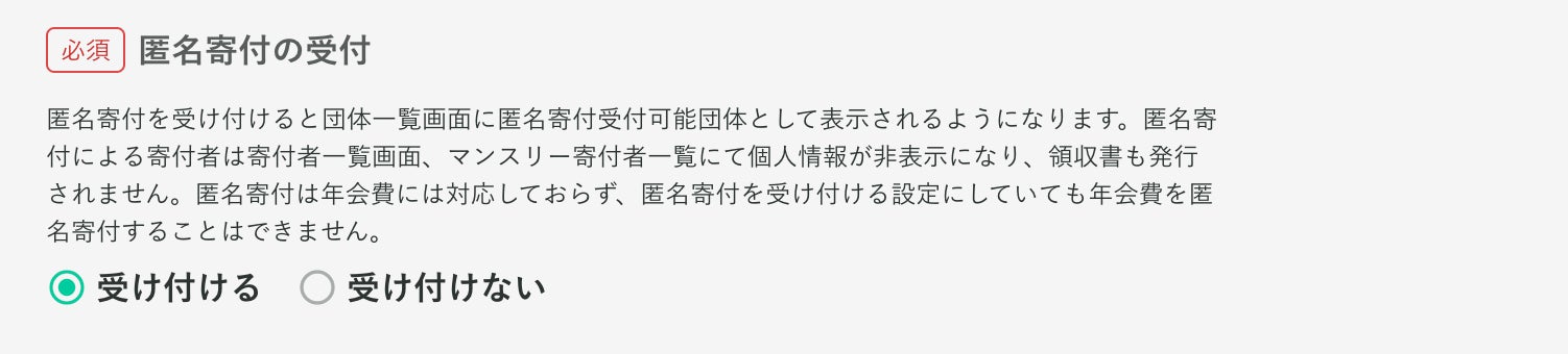 (※初期設定では全団体様共通で「匿名寄付の受付:受け付けない」に設定されていますので、ご利用になりたい場合は「受け付ける」を選択してください。)