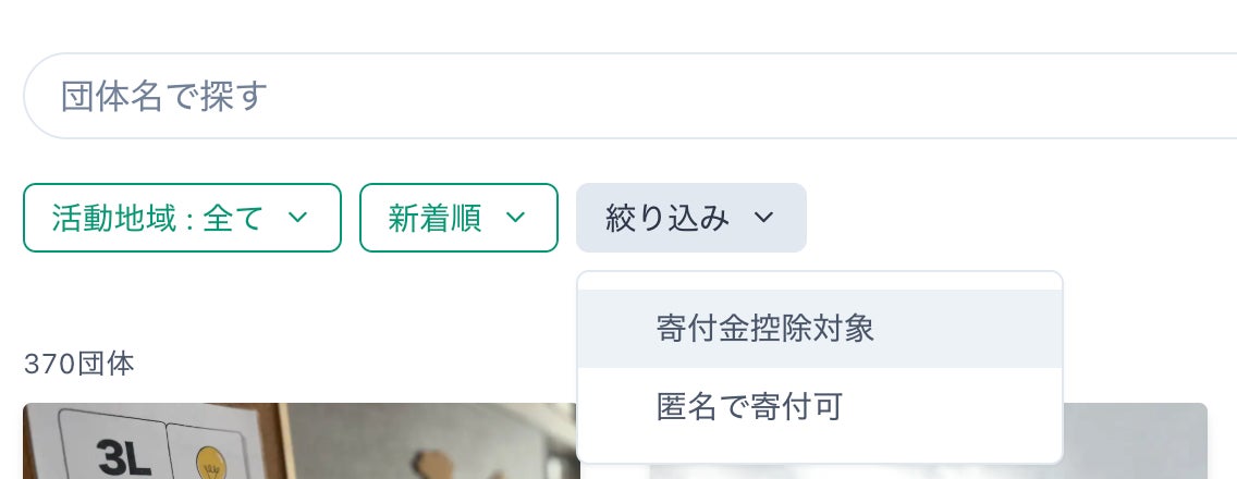 ・匿名寄付を受け付けている団体には「匿名で寄付可」のラベルが表示され、検索時に絞り込みできます。