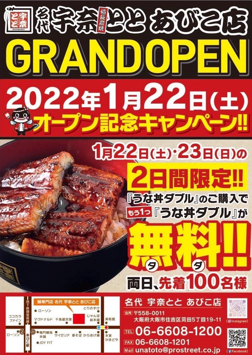 賑やかな商店街の一角に「名代 宇奈とと あびこ店」が1月22日にグランドOPEN!記念キャンペーンも実施します。