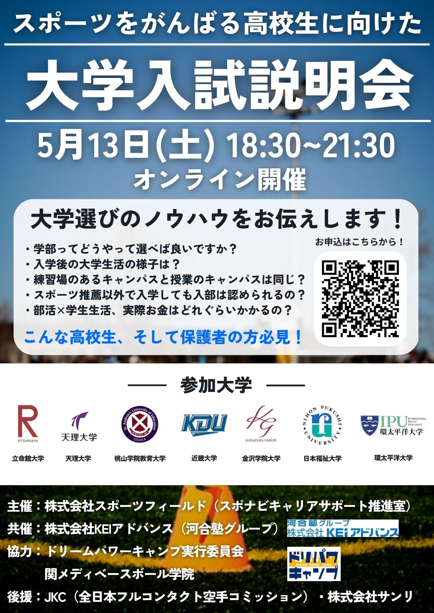 体育会・スポーツ学生のための就職活動支援サイト「スポナビ」を運営する株式会社スポーツフィールド(本社:東京都新宿区 代表:篠﨑 克志)は、5月13日に運動部学生の学びの支援等を行う河合塾グループの株式会社KEIアドバンスと共催で「スポーツをがんばる高校生に向けた大学入試説明会」を開催いたします。