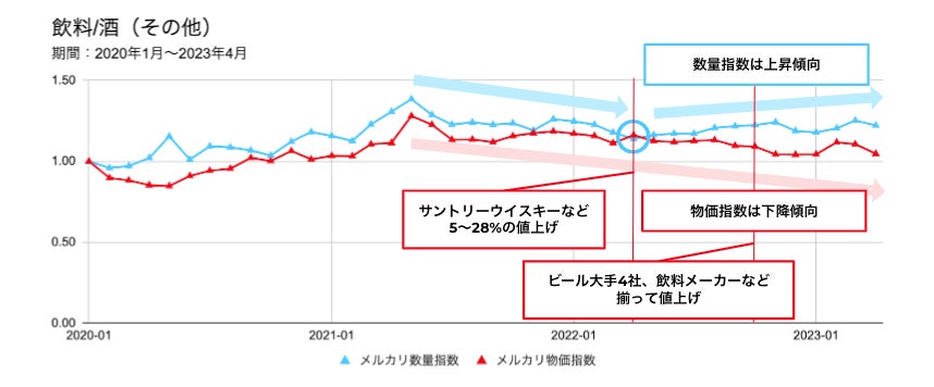 <ピックアップ>値上げが続く「飲料/酒(その他)」では数量指数は上昇傾向、物価指数は下降傾向に